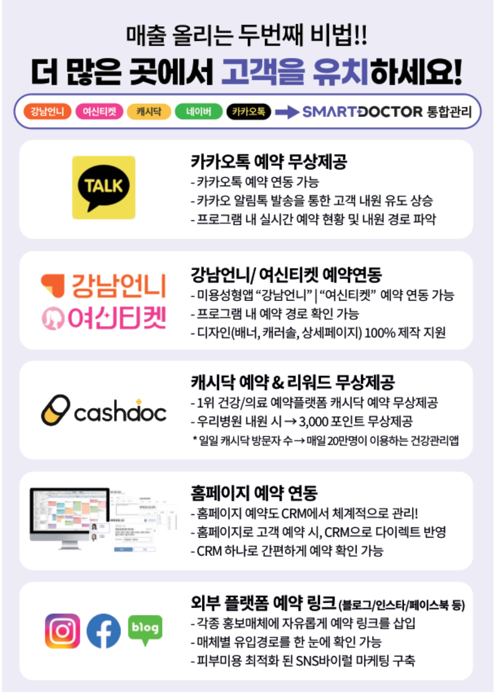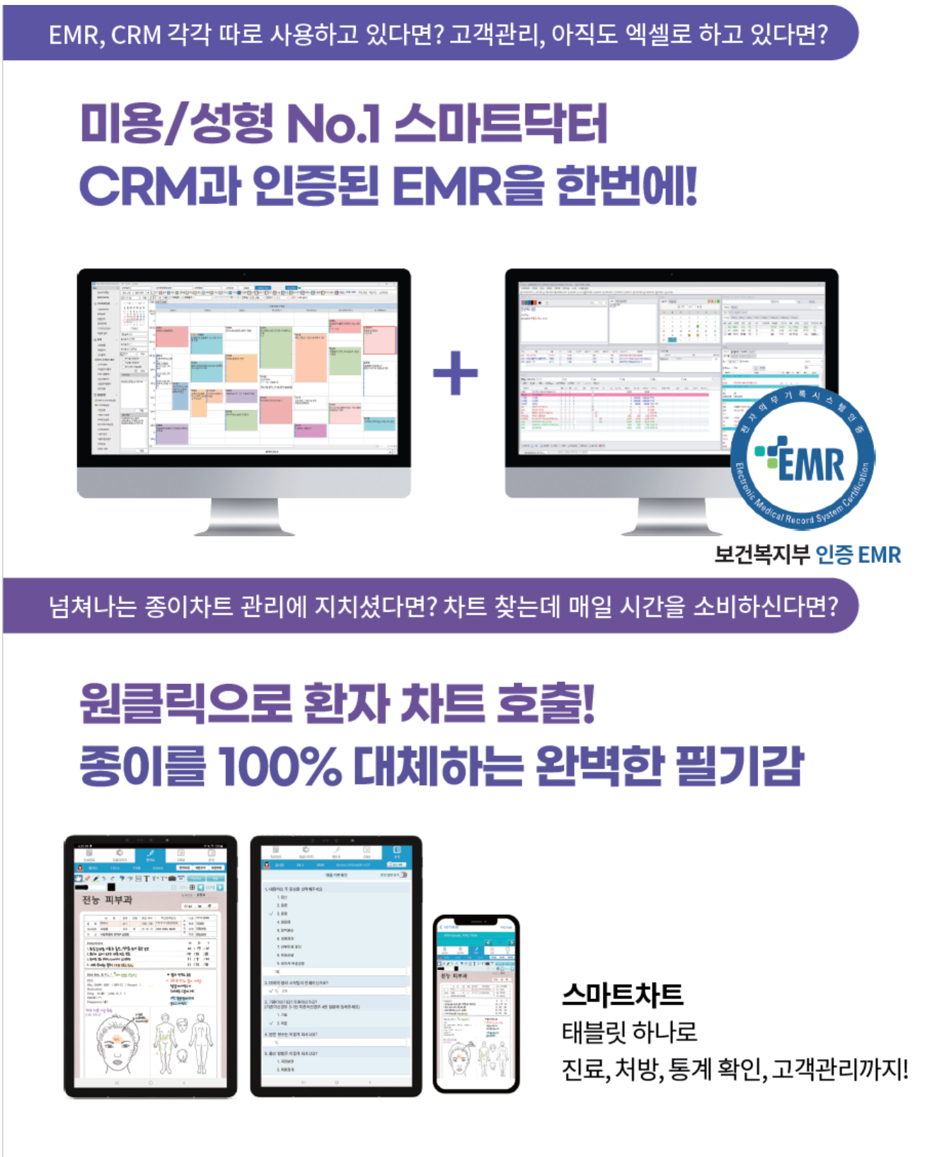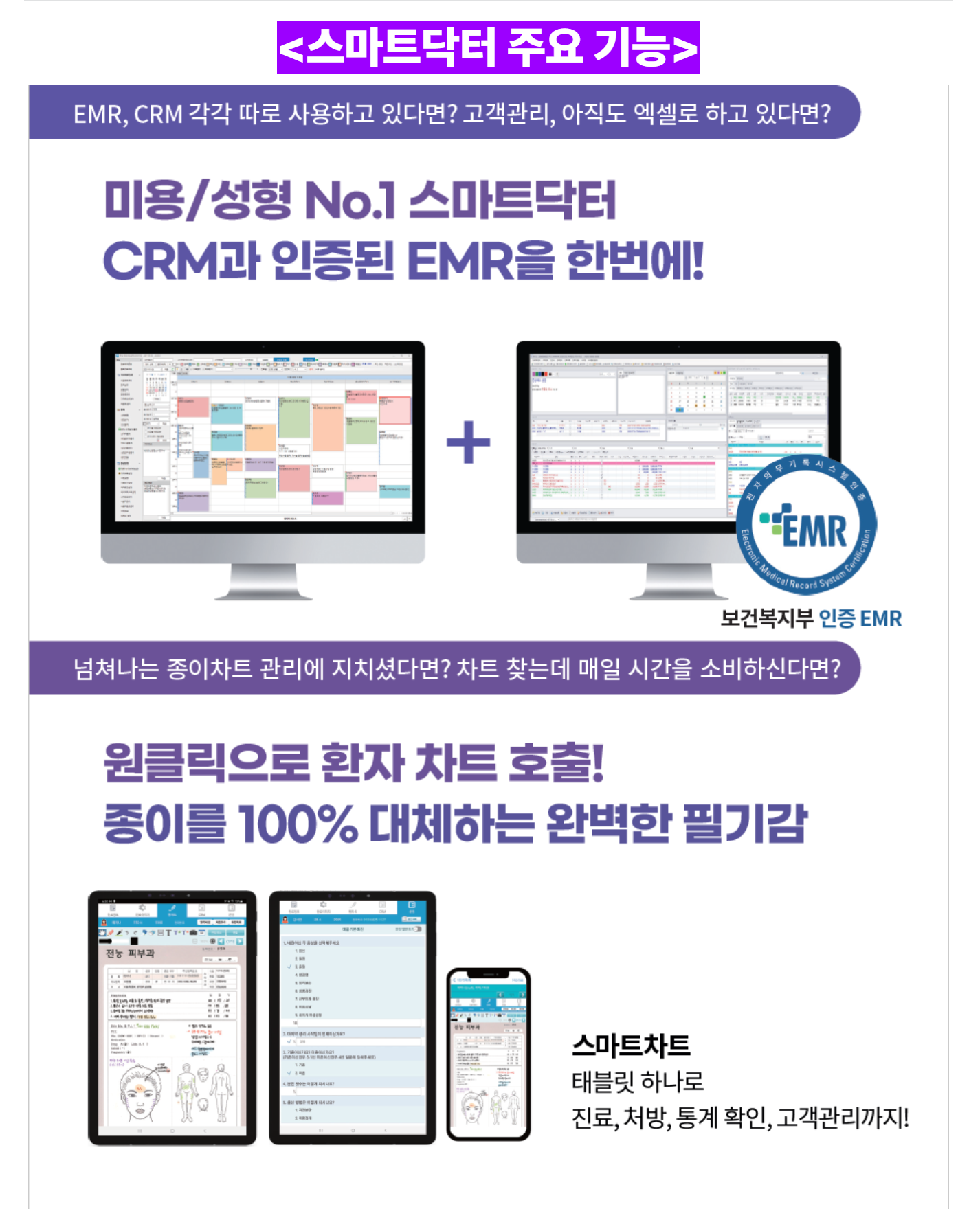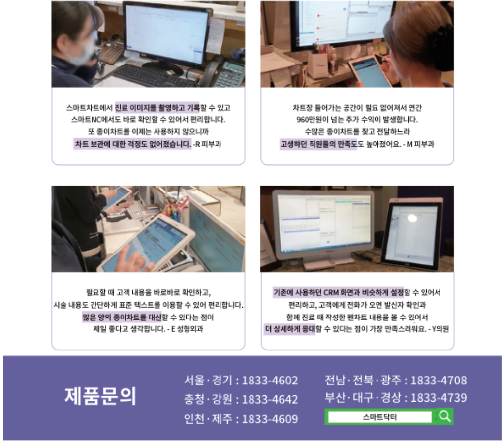 "스마트닥터"는 전국 3,527처에서 사용하고 있는 피부/미용/성형 NO.1 전자차트 업체 입니다. (수도권 점유율 48.2%)